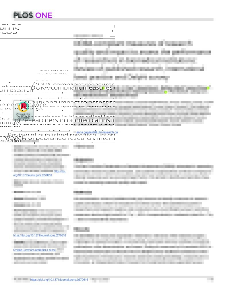 Gagliardi AR, Chen RHC, Boury H, Albert M, Chow J, DaCosta RS, et al. (2023) DORA-compliant measures of research quality and impact to assess the performance of researchers in biomedical institutions: Review of published research, international best practice and Delphi survey. https://doi.org/10.1371/journal.pone.0270616