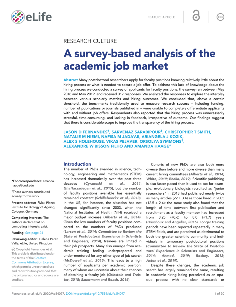 Fernandes JD, Sarabipour S, Smith CT , Niemi NM, Jadavji NM, Kozik AJ, Holehouse AS, Pejaver V, Symmons O, Bisson Filho AW, Haage A (2020). A survey-based analysis of the academic job market. doi: https://doi.org/10.7554/eLife.54097