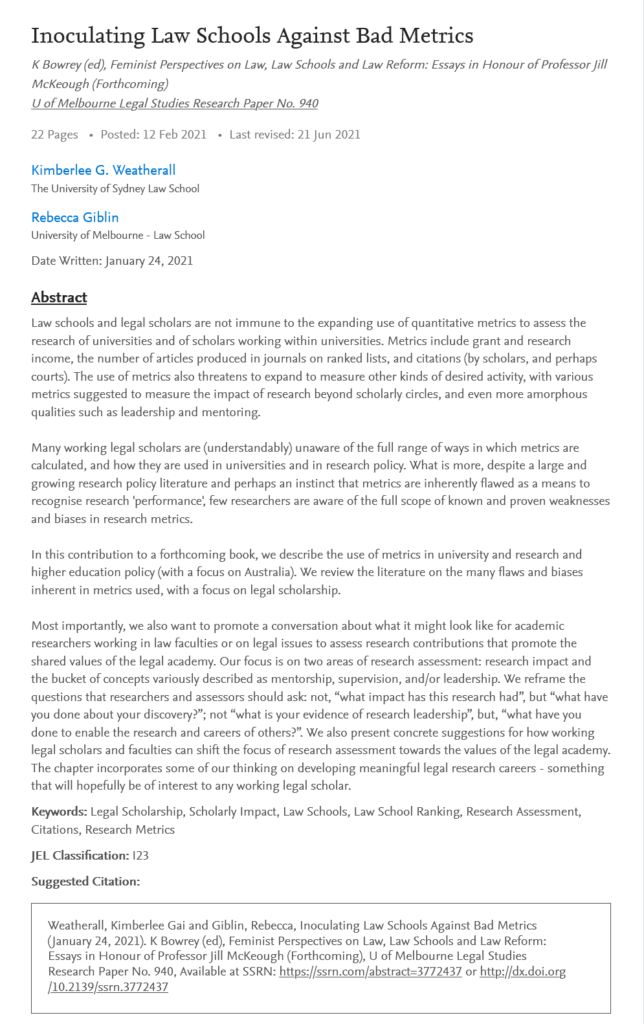 Weatherall KG and Giblin R (2021) Inoculating Law Schools Against Bad Metrics. doi: http://dx.doi.org/10.2139/ssrn.3772437