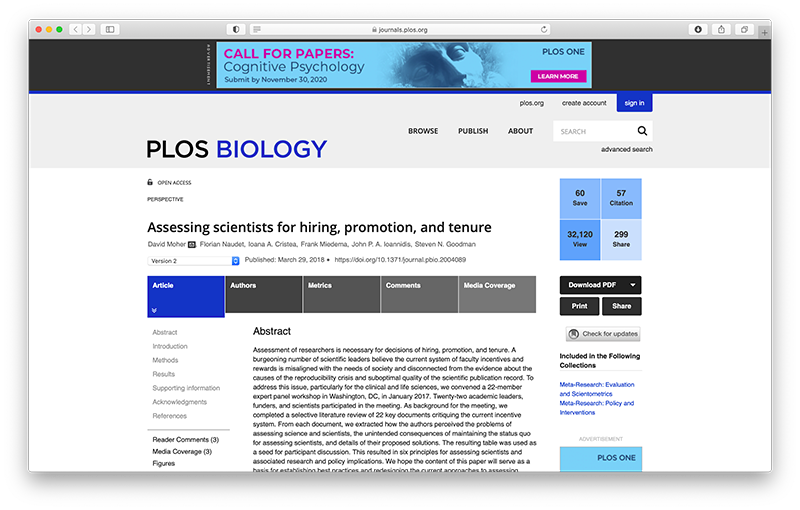 Moher D, Naudet F, Cristea IA, Miedema F, Ioannidis JPA, Goodman SN (2018). Assessing scientists for hiring, promotion, and tenure. https://doi.org/10.1371/journal.pbio.2004089