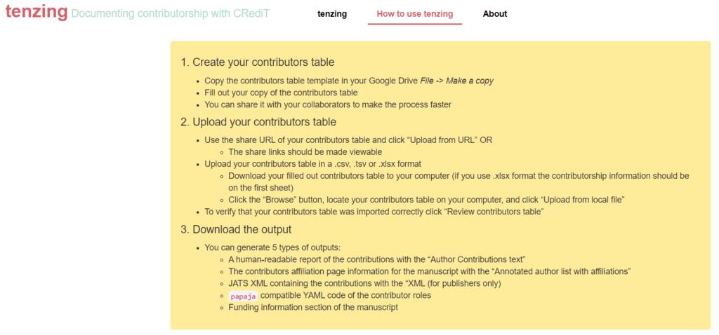 tenzing, a free and open-source tool, includes an online spreadsheet to indicate which CRediT categories each research team member is contributing to, as well as their names and affiliations. tenzing also provides a place to record and track contributions from the start of a project. This addresses a common issue: research teams today are often confronted with a requirement to indicate author contributions at the point of manuscript submission, without this information having been elicited earlier in the project, when it is less likely to lead to disagreement among the research team members. After researchers indicate their contributions during a project, when it is time to write a manuscript, tenzing can output the author contribution types in a concise manner suitable for manuscript title pages and author contribution sections.