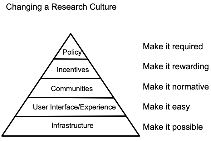Rogers’ ideas can be transposed onto a strategy for culture change that is specifically relevant to a reform movement within the scientific community. Innovators will pick up a new, better technique as soon as it is possible. They represent the cutting edge of adoption and only a tiny minority of the community, however, which is mostly not yet ready to modify their workflows. As the new techniques become easier to use, however, early adopters will pick them up and integrate them into their workflows, seeing the benefits of the practice to their work. The great swell of adoption only begins as norms shift and it becomes visible for the majority of the community to identify these actions and begin to take them up. As recognition for accomplishment is the basic currency of scientific rewards (see, for example, the role of citations in academic stature), more adopters will take up a practice as it becomes a more recognized and therefore rewarded practice. Then the community is able to quickly rally behind updated policies that will codify such practices as bring required.